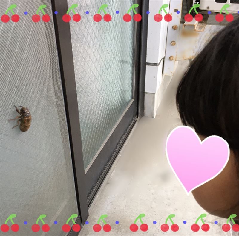 虫カゴからの移動をどうしようかと思っていたら、ポンちゃんがササっと取り出して、網戸に付けてくれました。